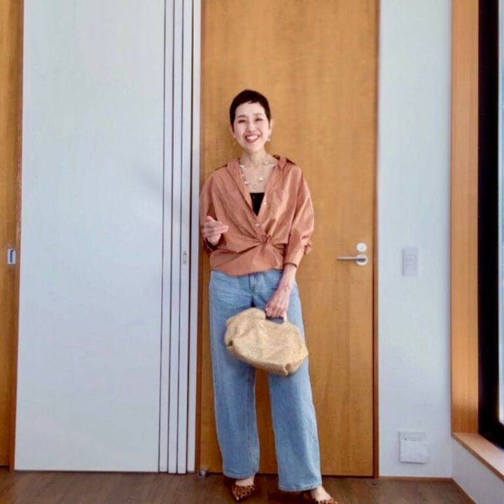 「シャツを裏からゴムでつまんで、カシュクール風にアレンジしました。これだけでぐっと女性らしさが出ます。バギーなジーンズはボリュームがある分、足元は細身で少し高さのあるヒョウ柄のキトゥンヒールを合わせて、バランスよくすっきりと。コーデのアクセントに、存在感のあるアクセサリーとバッグを追加して、華やかさも意識しました」(Otomatoさん)