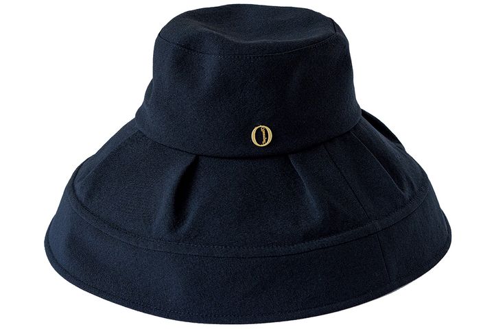 一級遮光の14cmつばが顔を包み込み、ほどよいトレンド感が魅力。帽子¥17,600(シャポー ド オー/Chapeau d’ O 東急プラザ銀座店)