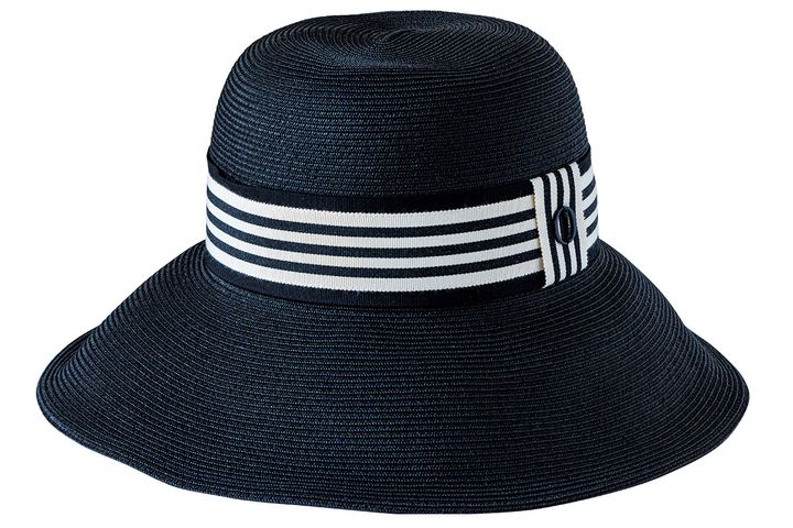 ボーダーリボンと大人可愛いチャームが、着こなしのアクセントに。帽子¥22,000(シャポー ド オー/Chapeau d’ O 東急プラザ銀座店)