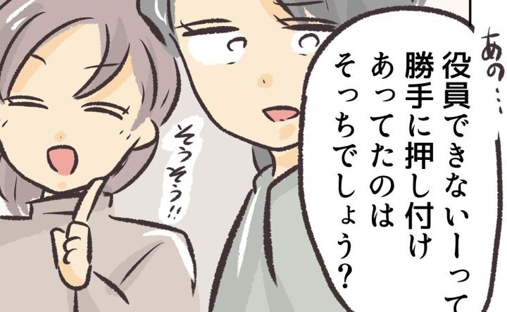 会議が始まった直後から「私は無理です」という保護者が続出し、まるで押し付け合いになっていたにもかかわらず、結果的には定員以上の希望者が……。これには「役員できないーって、押し付け合ってたのはそっちでしょう?」というママの言葉にも納得。役員を引き受けたくないあまり、数人の保護者が事を荒立てていただけなのかもしれません。