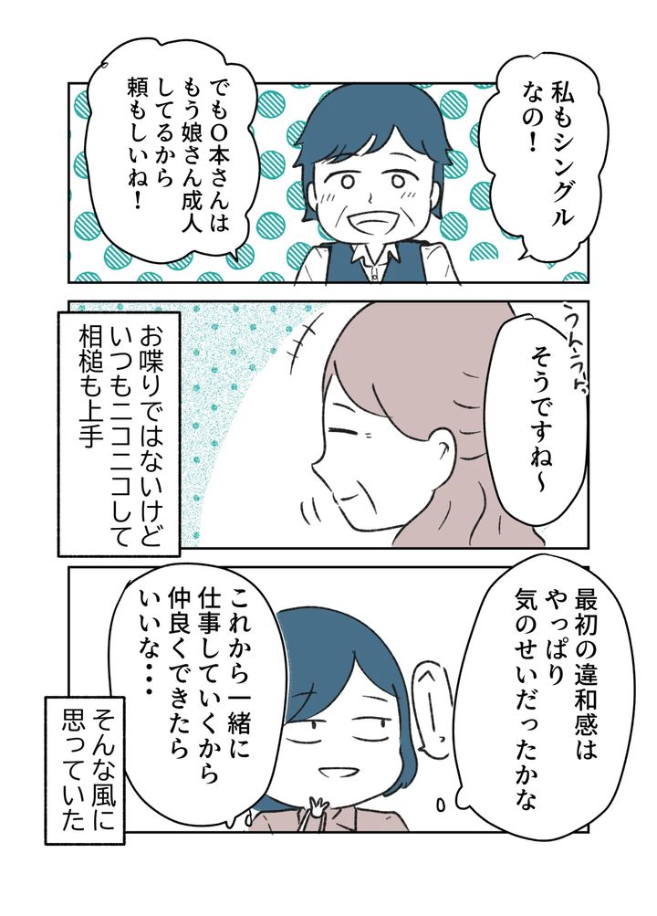上司と話すO本さんを見た魚田さんは、「良い人そうだけど謎の違和感を感じる」という第一印象は気のせいだと判断し、一緒に働いていく中で仲良くできたらいいなと思うようになっていました。