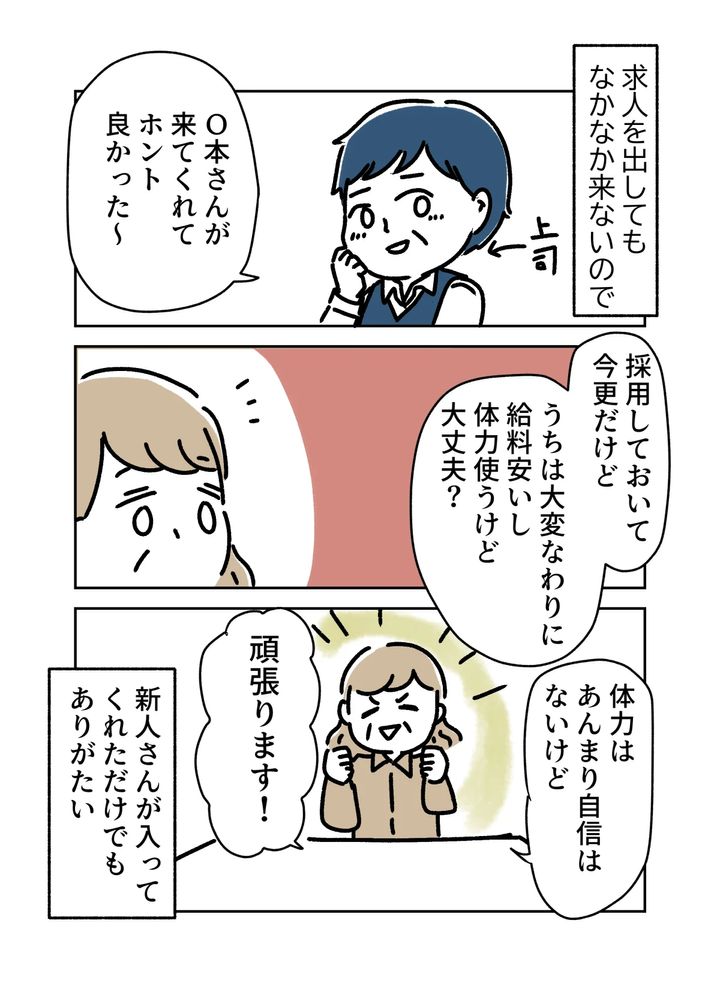 O本さんに対する第一印象は、「良い人そうだけど謎の違和感を感じる」でしたが、気にしないようにした魚田さん。常に人手不足な現場に、新しく人手が入ってきてくれたことに感謝していました。