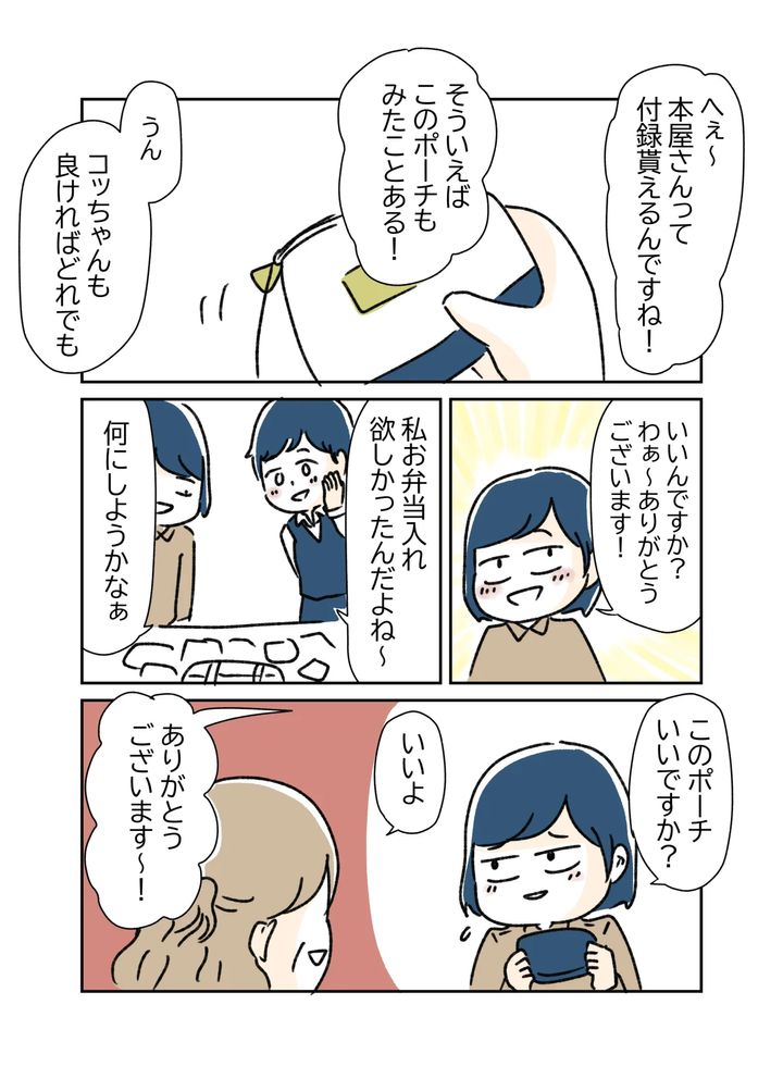 ある日の昼休憩で、O本さんは沢山のトートバッグやポーチを机の上に広げました。前に本屋さんで働いていたO本さんは、雑誌の付録をもらうことが多かったそうで、自分だけでは使い切れないため、持ってきたとのこと。