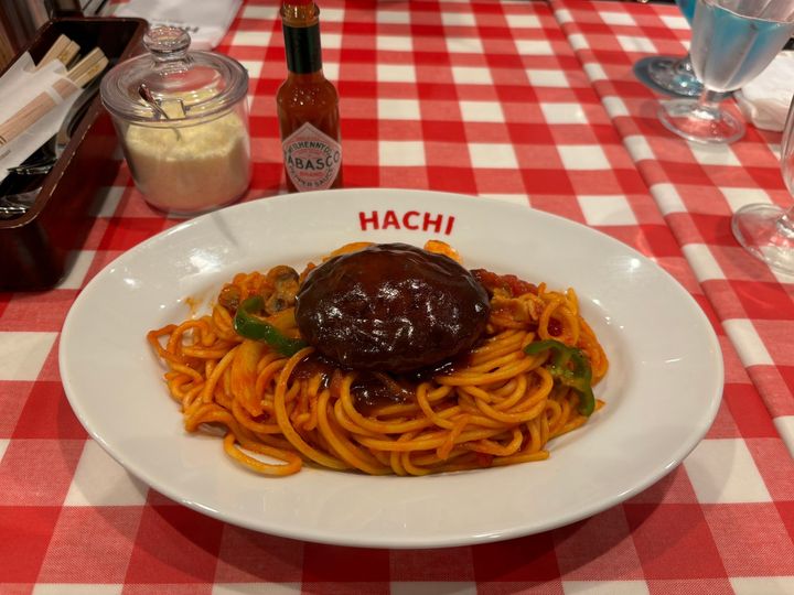 そして楕円のHACHIと書かれたお皿にナポリタンが乗り、その上にハンバーグ。輝きすぎている。ハンバーグをど真ん中のあの位置に置いてくださったことに、とても感謝したい。あの位置こそが、ハンバーグにとっても、ナポリタンにとっても最良であり、この輝きを維持しているといえるのではないだろうか。
