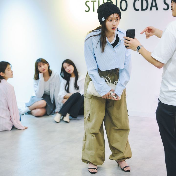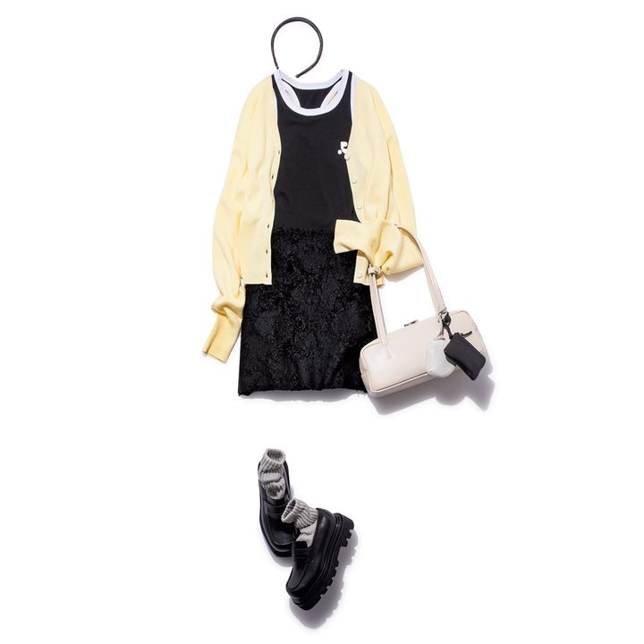 2.イエローカーディガン¥26,700(ORR/HANA SHOWROOM)フリンジミニスカート¥23,700(ORR/HANA SHOWROOM)バッグ¥14,915(STAND OIL/MUSINSA JAPAN)チャームポーチ各¥18,700(ともにNOTHING WRITTEN/マルティニーク ルミネ横浜)靴¥26,250(ROUGHNECK/ハナ コリア)靴下¥1,210(靴下屋/タビオ)カチューシャ¥18,700(アレクサンドル ドゥ パリ/アレクサンドル ドゥ パリ GINZA SIX店)ロゴタンクトップ着回し