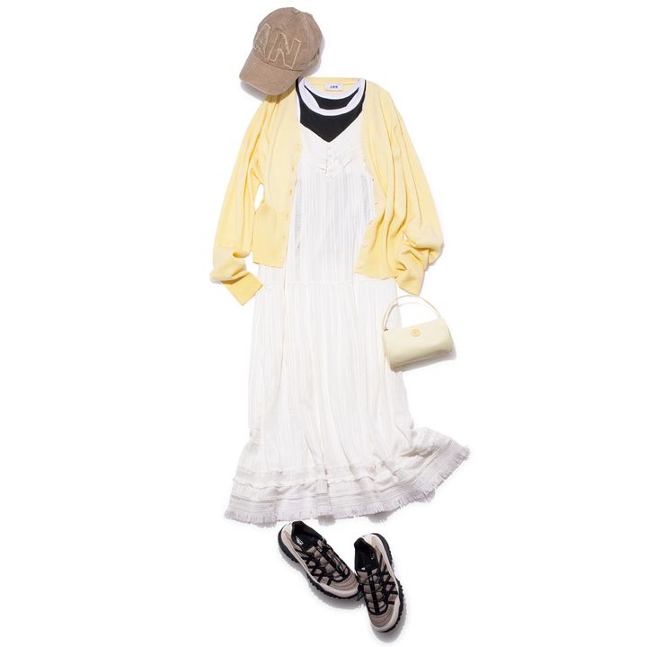 4.イエローカーディガン¥26,700(ORR/HANA SHOWROOM)レースキャミワンピース¥41,800(KUMÉ)バッグ¥11,330(minitmute/HANA SHOWROOM)靴¥11,000(FILA/フィラ カスタマーセンター)帽子¥15,400(AWESOME NEEDS/ユー バイ スピック&スパン ルミネ池袋店)ロゴタンクトップ着回し