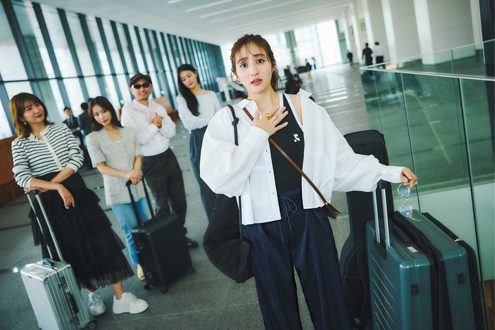 1.ブラウス見え白シャツ¥34,100(ORR/ノーブル 有楽町マルイ店)ネイビーラインパンツ¥14,760(rolarola/nugu pressroom)ショルダーバッグ¥15,500(トゥティエ)バッグ¥15,180(イムラム)メガネ¥38,500(SPRING STRINGS/SHOWROOM CHRMR)イヤカフ¥13,200(アルティーダ ウード)リング¥13,200(ラ・スール)スーツケース/スタイリスト私物 ロゴタンクトップ着回し