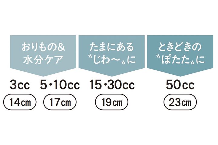 各メーカーともラインナップが豊富で迷うと思いますが、パッケージに表記されている吸水量と長さ以外に尿もれの仕方やおすすめシーンも選ぶヒントに。吸水量の大きいものを長時間つけっぱなしにするのではなく、自分の1回あたりの尿もれ量に近そうな商品から試してみてください。