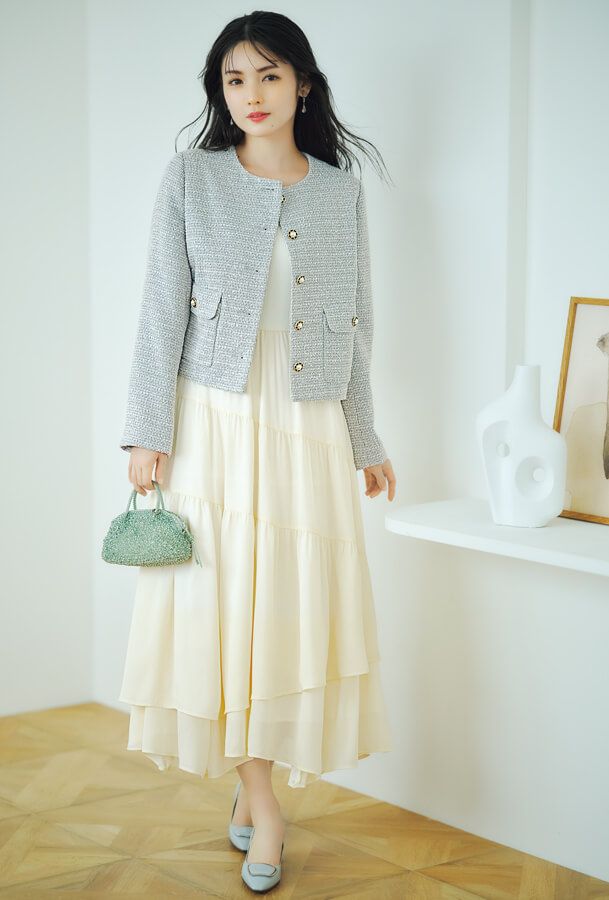 ジャケット¥17,600/Swingle(Swingle 有楽町マルイ店) ワンピース¥25,300/アプワイザー・リッシェ イヤリング¥19,800/アンテプリマ(アンテプリマ 新宿髙島屋店) バッグ¥47,300/アンテプリマ/ワイヤーバッグ(アンテプリマ ジャパン) 靴¥24,200/銀座かねまつ(銀座かねまつ6丁目本店)