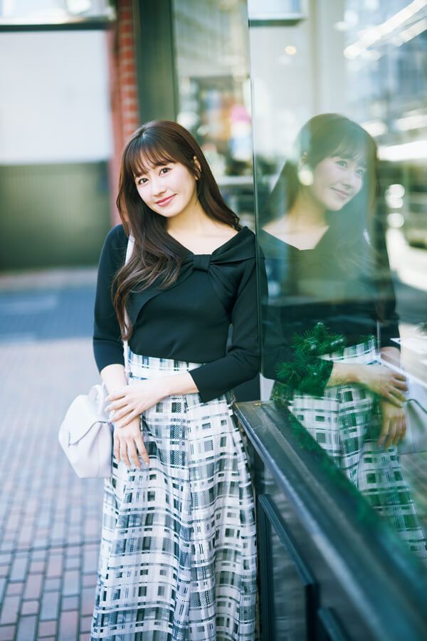 オフショル部分にリボンデザインを効かせた1枚。存在感のあるチェック柄スカートで自然と目線を下げれば甘口リボンも難なくクリア。