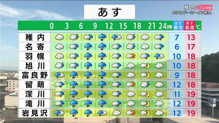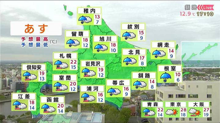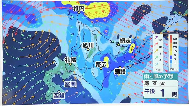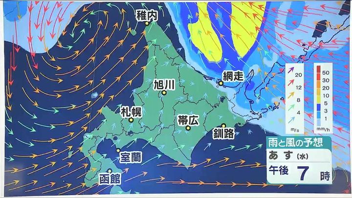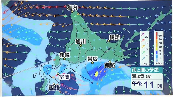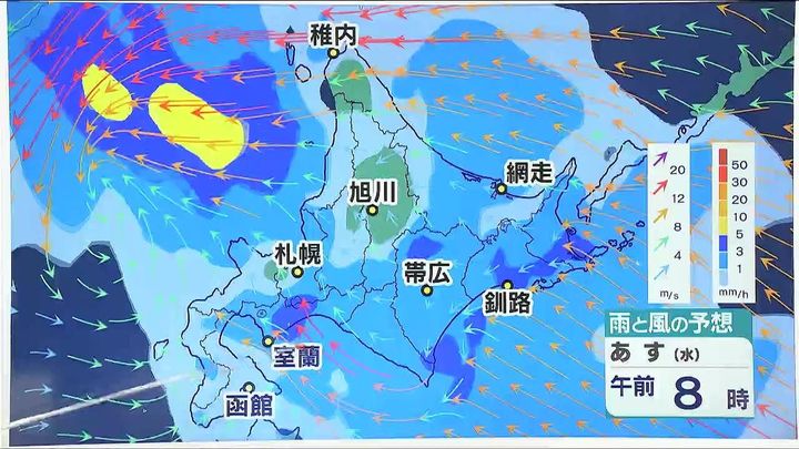 あす朝は全道的に雨で、海岸部や札幌周辺では風も強まります。