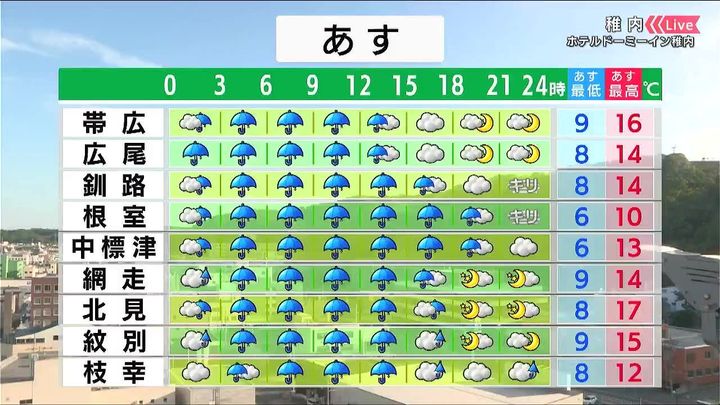 日中は各地で雨が降るでしょう。海岸部を中心に傘がさしにくくなるほどのやや強い風にも注意して下さい。最高気温、帯広の16度、根室の10度はともに4月下旬並みです。