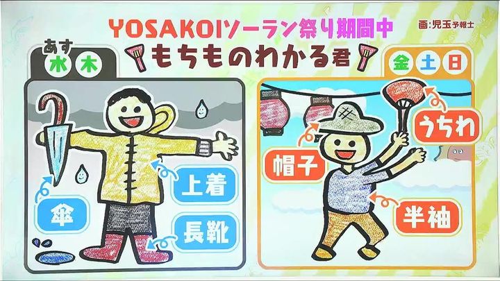 あす4日(水)からYOSAKOIソーラン祭りが始まります。今回はお祭り期間中の持ち物が分かる、もちものわかる君です。