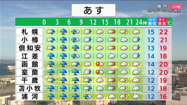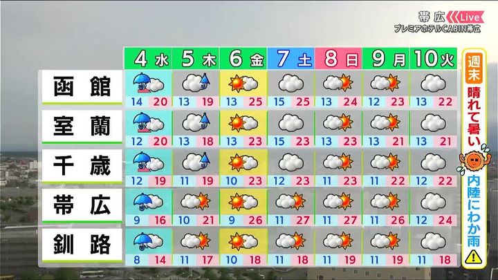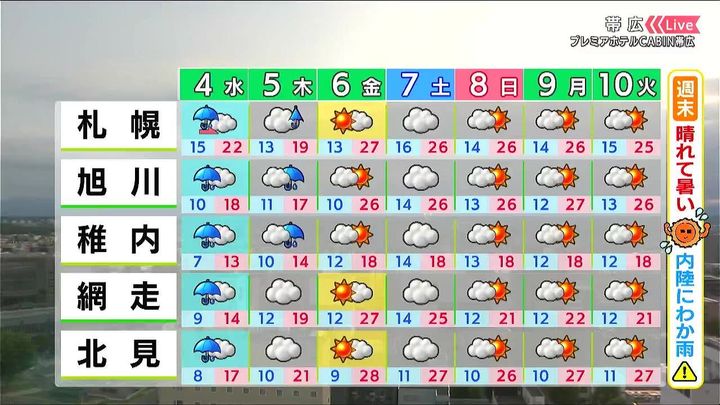 木曜は道南方面で昼頃まで雨の降るところがあるでしょう。週末は晴れて、最高気温は25度前後と一気に夏の暑さになりそうです。服装選びに気を付けて下さい。
