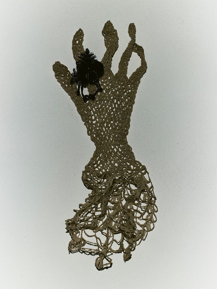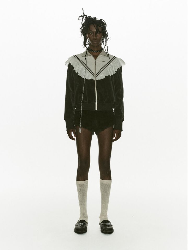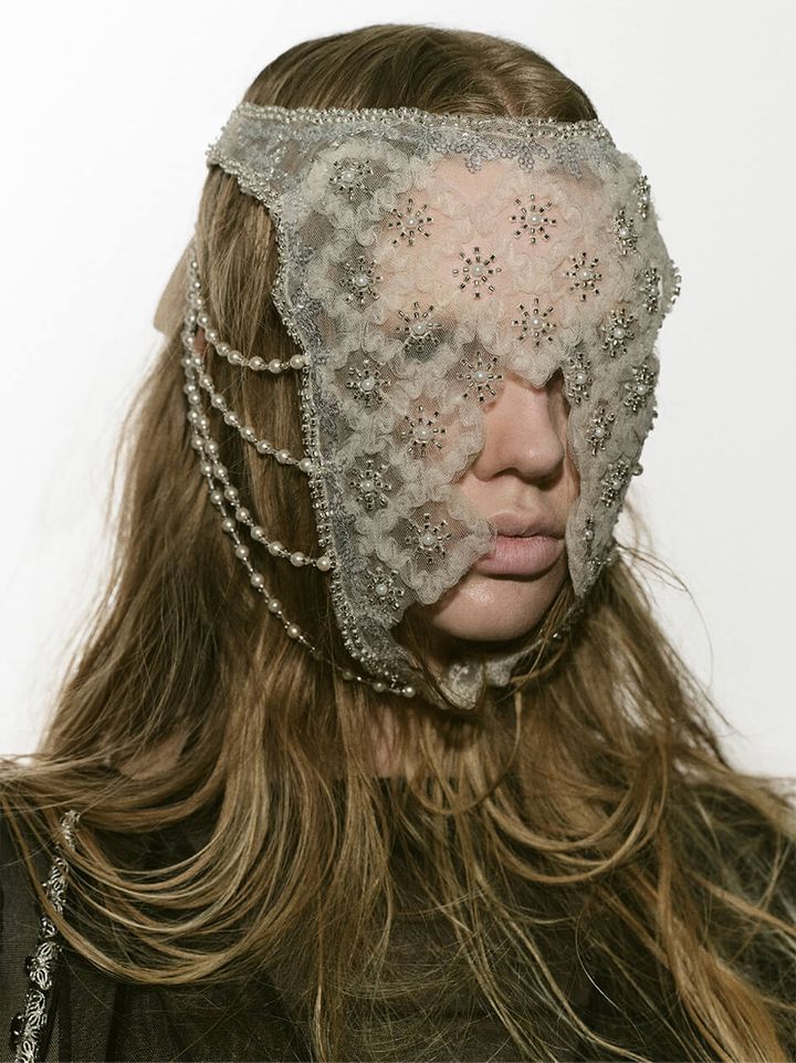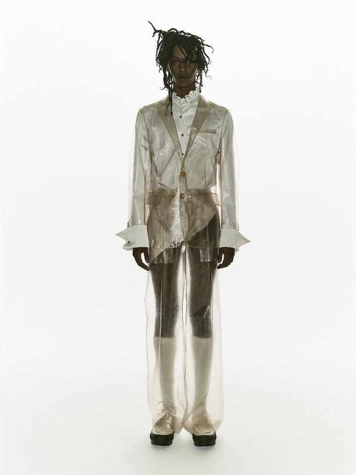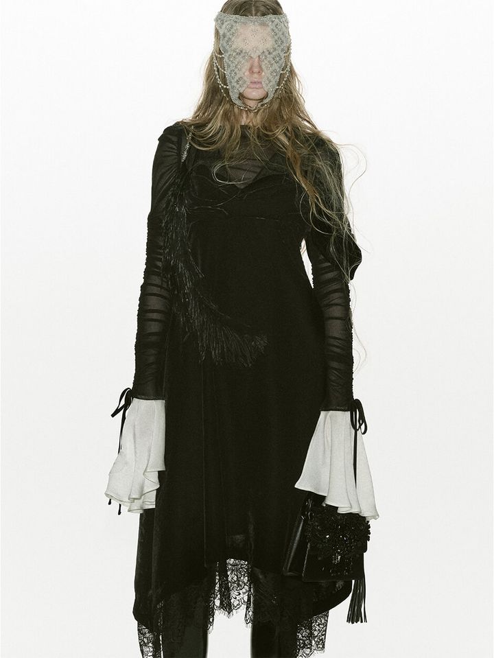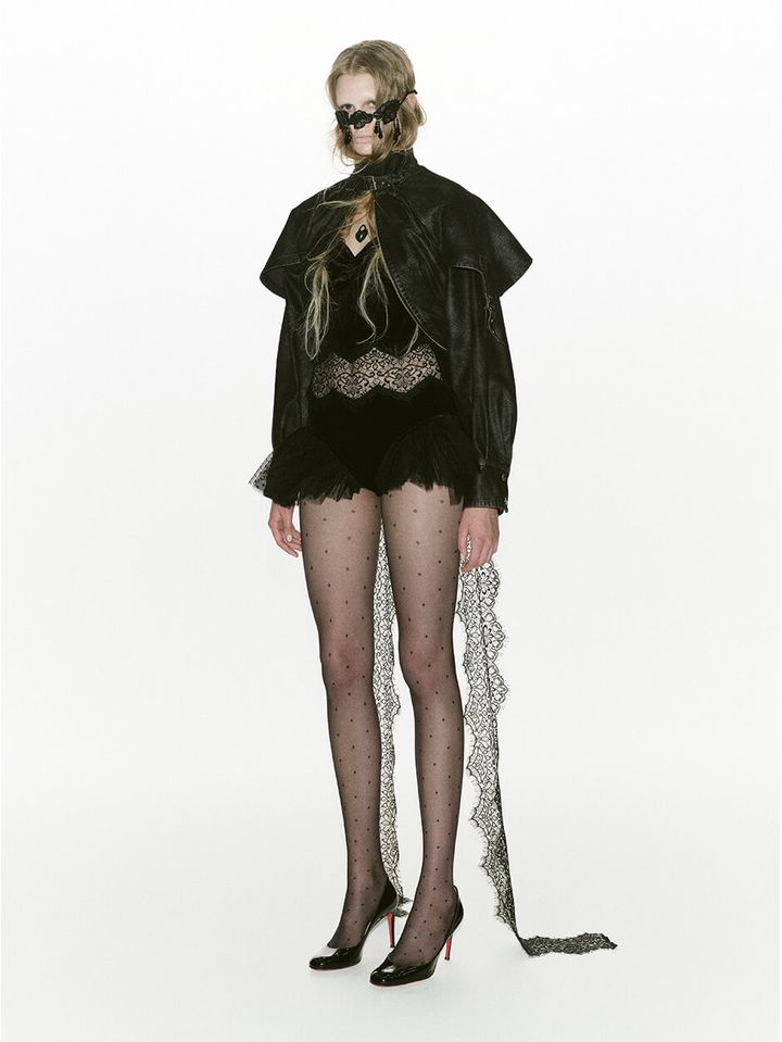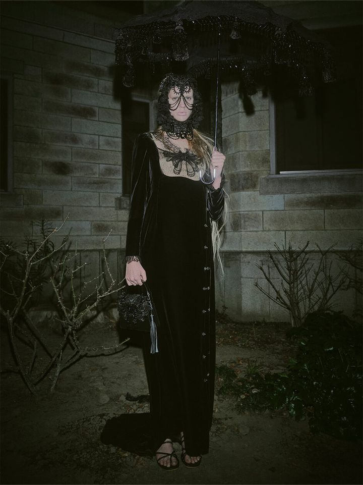 ベロアのジャケットやドレス、レザージャケット、シアートップスなどさまざまな黒のアイテムが展開され、鱗のようなベージュのセットアップやレースのフェイスアクセサリーは対照的な儚い美しさを放っている。