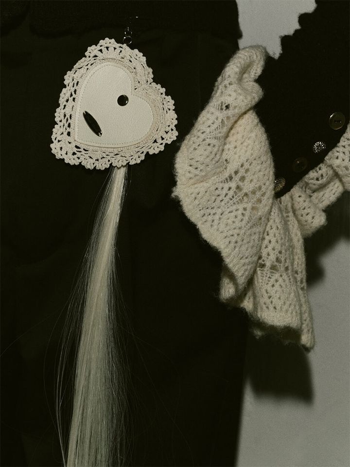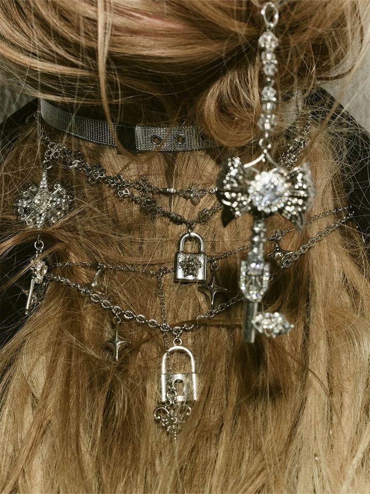 裾から垂れ下がった無造作なレースやフリルと多様なモチーフが組み合わせられたシルバーネックレスは、コレクションテーマのヴィンテージ感を反映。