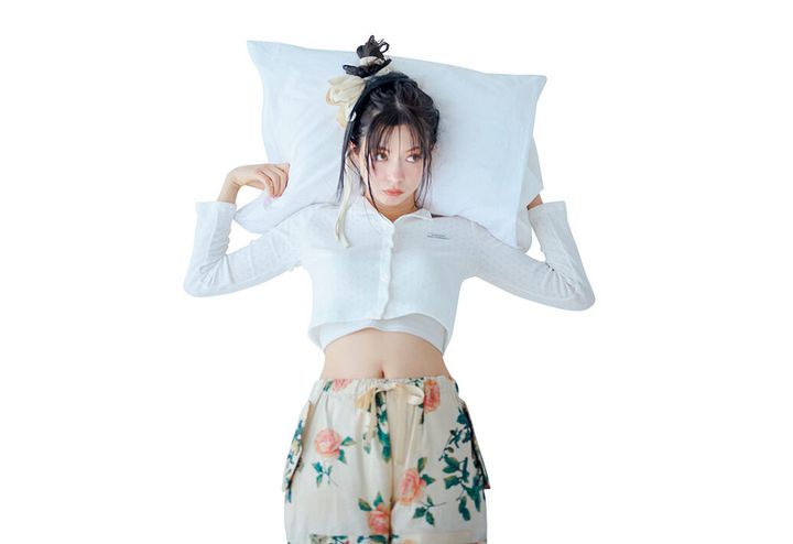 白カーデ ¥7,600(CRANK/HANA KOREA)、花柄パンツ ¥42,900(River/ワングラムチャン02.03)、チューリップヘアアクセ ¥18,700(LEINWANDE/ラインヴァンド カスタマーサポート)、ネックレス ¥1,760(NADIA FLORES EN EL CORAZON)、ベアはスタイリスト私物