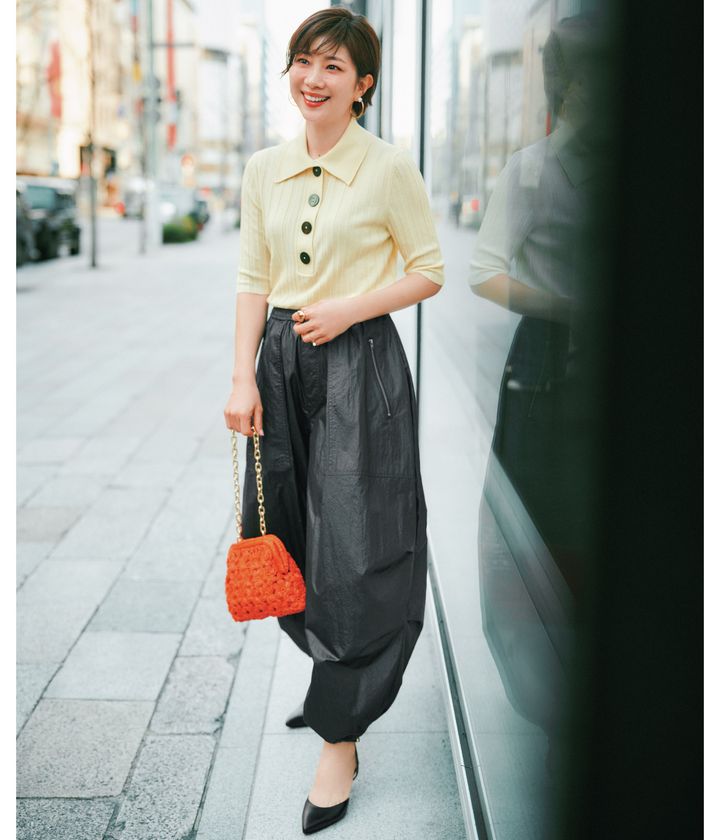 動きやすくてサラッと快適なシャカパンにたまごイエローのポロニットを合わせて街でも浮かないスポーティコーデに。赤やオレンジなど鮮やかカラーの小物をプラスして、さらにフッ軽な印象を高めてごきげんな私を演出。