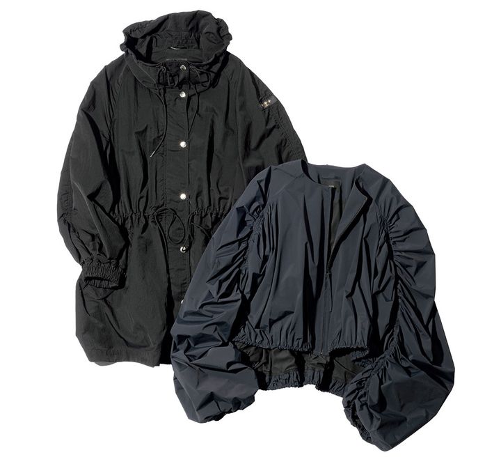 〈右〉一枚で映えるボリュームスリーブ。ブルゾン[防水・防風]¥44,000(LE PHIL/LE PHIL NEWoMan 新宿店)〈左〉ドロストで美シルエット。ブルゾン[撥水]¥114,400(タトラス/タトラス 銀座店)