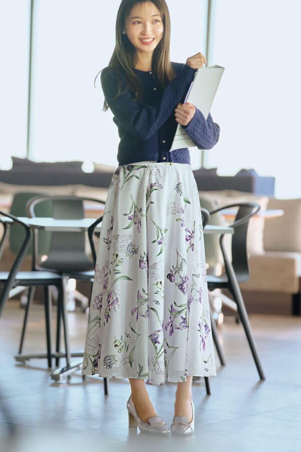 清涼感のあるラベンダーフラワーのスカートをネイビーアンサンブルで上品に