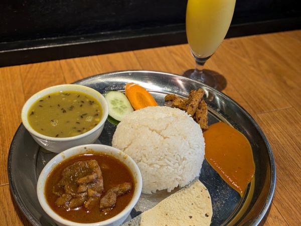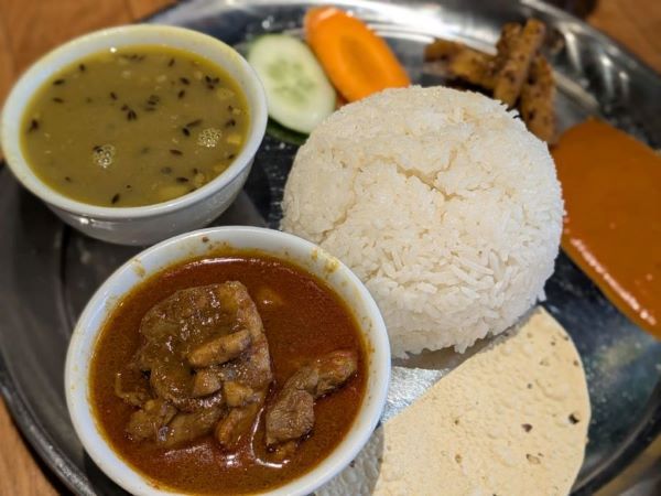 この日いただいたのは、ディーナ―セットの中の「チキンカナセット 激辛」(800円)。辛さは甘口~激辛までの5段階から選べます。(同一料金) 「カナ」とはネパール語で量が十分なしっかりとした食事のこと。因みに軽食を「カジャ」というそうですよ。