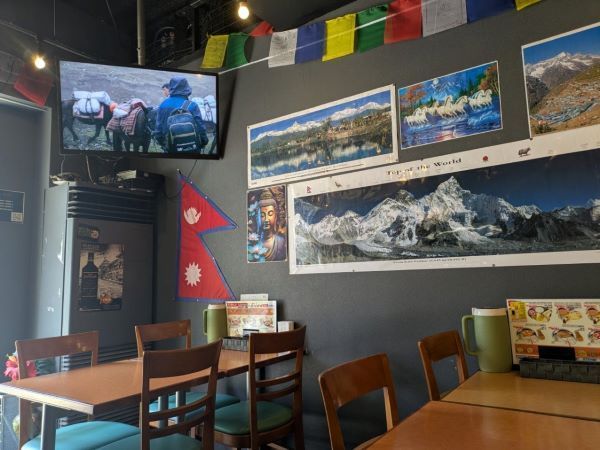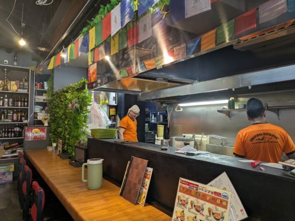 インドとネパールの国旗やインテリアに加え、音楽も映像も現地の雰囲気さながらの店内。