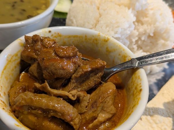 山盛りのライスですが、塩味強めのダルといただくと見る間に減っていきます。そして、メニュー表には記載されていないのですが、「お替わりはどれでも何回でもできますよ。」と提供された時に耳を疑った一言を途中で思い出しました。特に気に入ったチキンカレーをお替りしたのですが、「他は大丈夫?」と聞かれ、大食いの私もタジタジになりながら、遠慮させていただきまました(笑)流石に2回目のカレーはお肉は少な目でしたよ♪