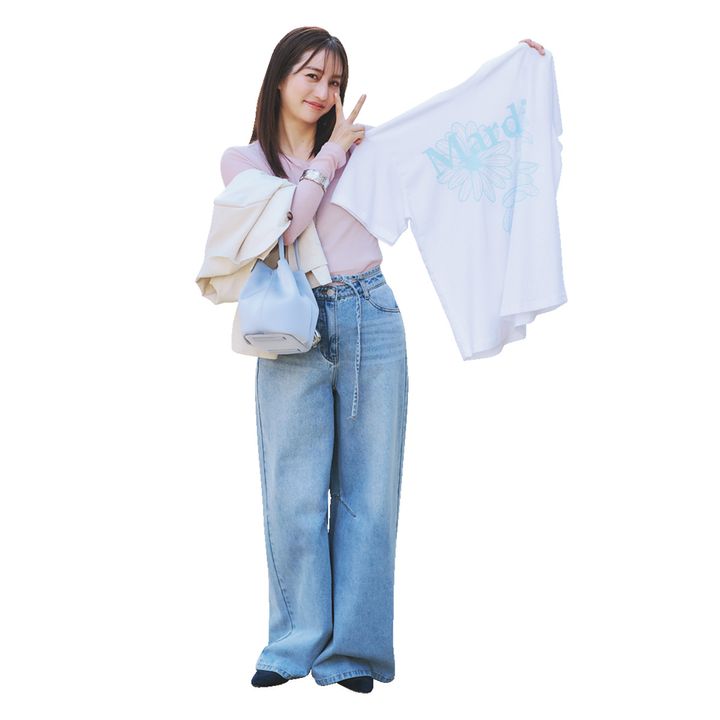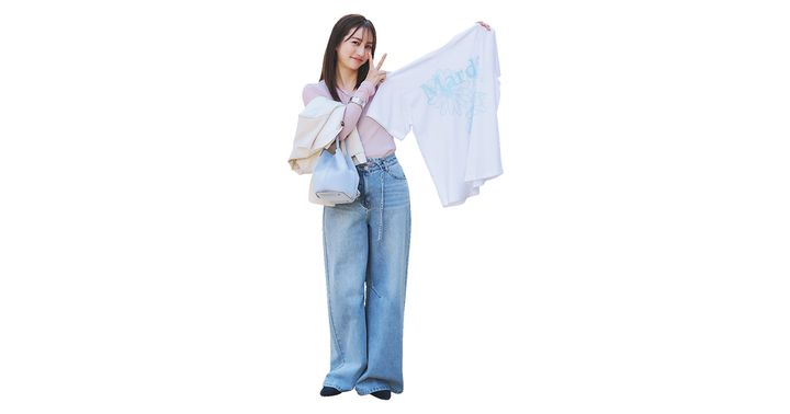 バッグ¥30,400(ルメン)靴¥31,500(トゥティエ)バングル¥66,000(ラ・スール)手に持ったTシャツ¥6,050(Mardi Mercredi/マルディメクルディジャパン)