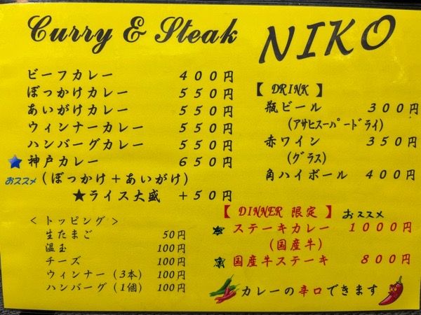 一番人気は?「どれもまんべんなく出てるよ」と気さくな店長より。おススメはずばり!「ステーキカレー」(1000円)。赤身の国産牛肉を使った贅沢なカレーはディナー限定です。牛すじ肉のぼっかけ+切り落とし肉のあいがけ2種類の牛肉が入った「神戸カレー」(650円)もおススメだそうですよ。コスパが良過ぎるので全メニュー食べ尽くしたいですね。 3月3日に移転オープンした「Curry&Steak NIKO」以前は、EKIZO神戸三宮の南側、JRの高架下で営業していました。その頃から数えると6月で1周年になり、6月6日(金)、7日(土)には1周年記念を予定しているそうです。楽しみですね♪ 駅近、神コスパ、お肉屋さんの本気カレー「Curry&Steak NIKO」のカレーをぜひコンプリートしてみてはいかがですか?