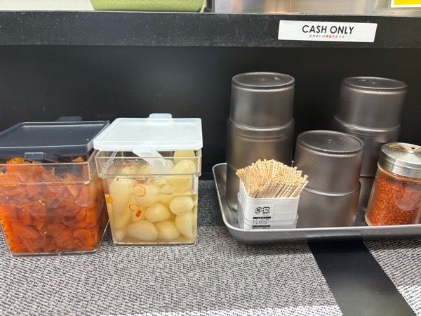 福神漬けや七味、こだわりのらっきょうは嬉しい無料です。お支払いは前払いの現金のみです。テイクアウトもOKですよ。カレーは待ち時間もほとんどなく駅近なので昼の休憩時間や仕事帰りなど気軽に利用できそうですね。