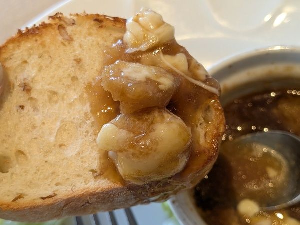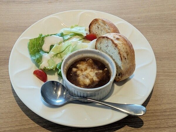 ライ麦パン2つにサラダ、スープがついた軽めのモーニング。ライ麦パンとオニオングラタンスープの相性もバツグンです!