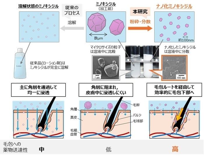 しかし、通常のミノキシジル製剤では粒子のサイズが比較的大きいため、薬剤が毛包の深部まで十分に届きにくいという課題がありました。