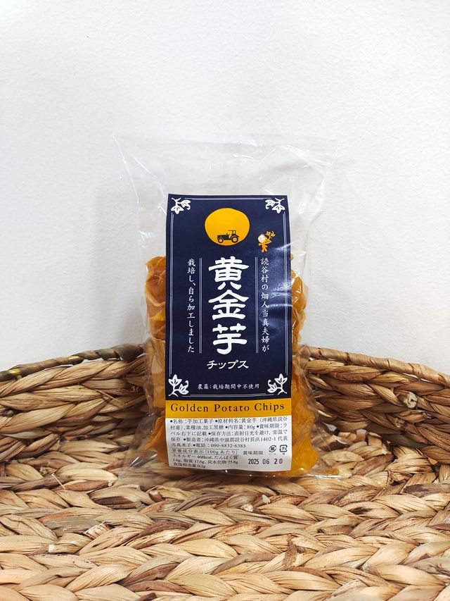 人気のポイント:読谷村(よみたんそん)の畑人(はるさー:「農家」の意味)・当真夫婦が農薬や化学肥料を使わずに栽培した紅芋を、自ら加工したチップスは優しい甘みが大人気!!
