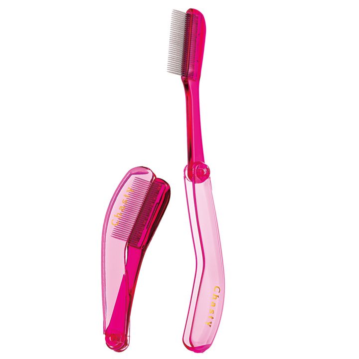 「マスカラ後に、とかすかとかさないかで仕上がりは雲泥の差。先端が密なコームでとかすと1本1本まつ毛を綺麗に広げセパレート。折りたためるタイプだからポーチに入れられて便利」ピッチ0.74mmの金属性コーム。チャスティ マスカラコーム メタルN マジェンタP(ナチュラル)¥770(シャンティ)