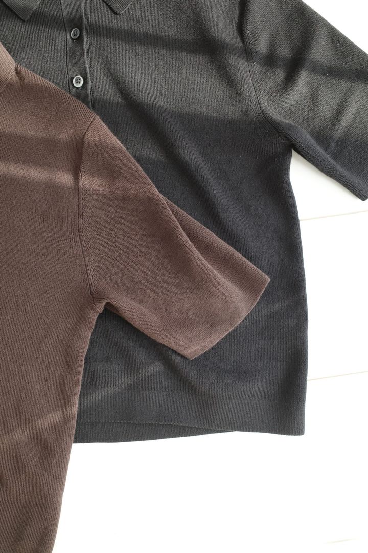 「コットンレーヨン素材で、なめらかな肌触りが気持ちいい! コンパクトなシルエットで、着用すると膨張せずにスッキリ見えるのも高ポイント。購入したブラックとダークブラウンのほか、オフホワイト、イエロー、ネイビーの5色展開。ジャストサイズで着たい人はいつものサイズより1つ小さめを選ぶのも良さそう。編集部で着用しているとスタイリストさんやライターさんから“それ持ってる!”と1日に何回も声をかけられる現象が(笑)。身長159cmのライター川原は通常Mサイズですが、Sサイズを購入しました」