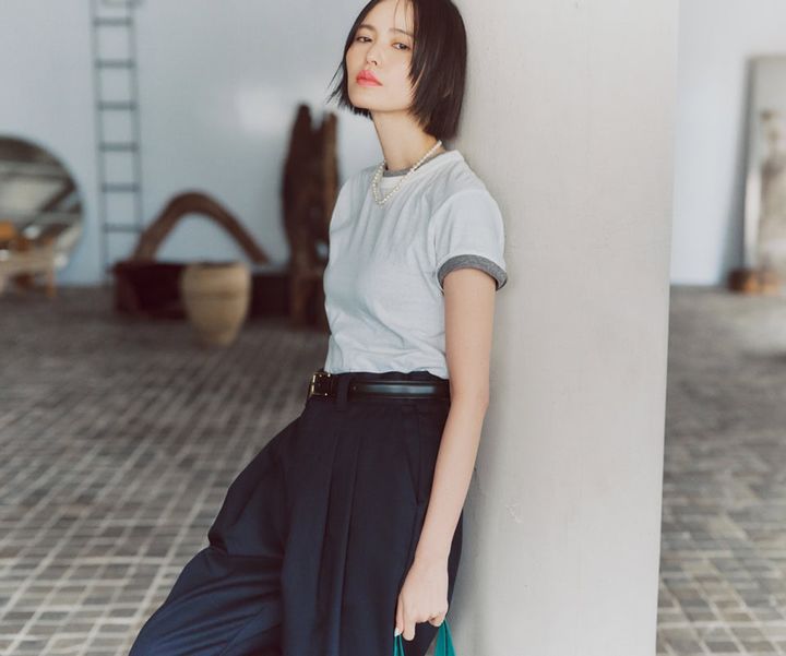 Tシャツ各¥7,480、パンツ¥20,900、ベルト¥15,180(全てザ シンゾーン/シンゾーン 表参道本店)、バッグ¥4,950(ル タロン/ル タロン 有楽町マルイ店)、ネックレス¥13,200(Pearl for Life/ロードス)、スニーカー¥6,590(ザラ/ザラ カスタマーサービス)