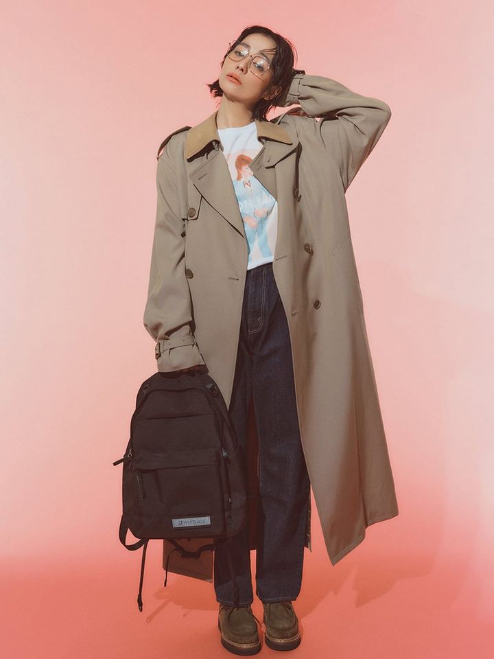 バックパック¥36,300(ホワイタージュ)、トレンチコート¥154,000(オーラリー)、Tシャツ¥8,250(ブルースセントリック/メイデン・カンパニー)、デニムパンツ¥26,400(ブルーブルー/ハリウッド ランチ マーケット)、メガネ¥60,610(オリバーピープルズ/ルックスオティカジャパン カスタマーサービス)、シューズ¥69,300(ニードルズ/ネペンテス ウーマン トウキョウ)