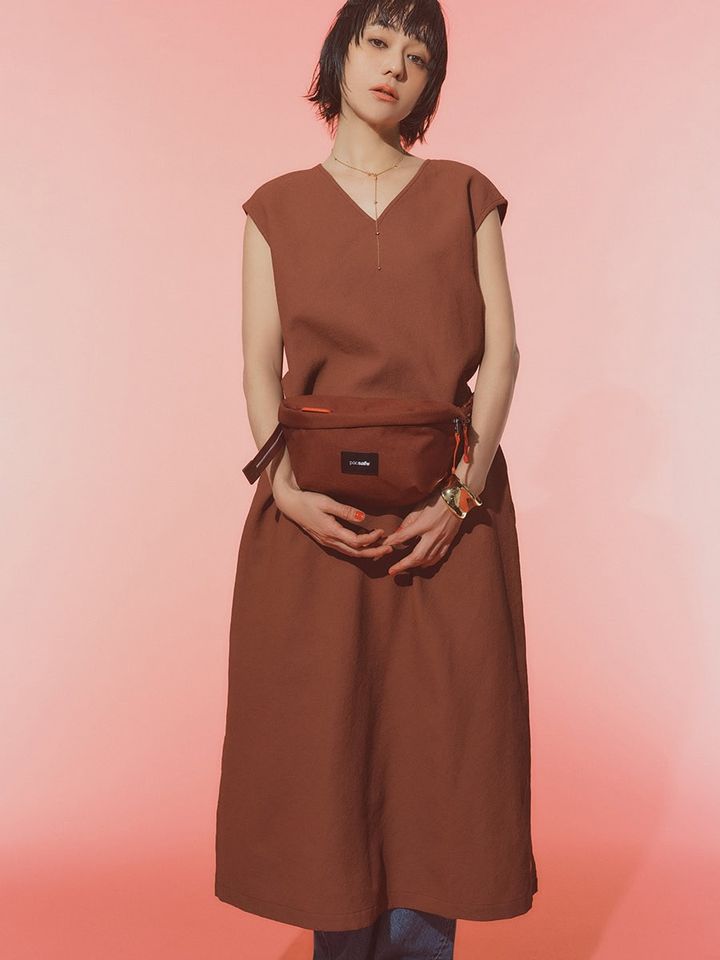 天然素材のようでいて実はハイスペックなドレスと、イージーな雰囲気とは裏腹に、最強のセキュリティを備えたバッグ。どちらもウォームブラウンのワントーンで揃え、デニムルックに大人の落ち着きを添えたスタイリングです。