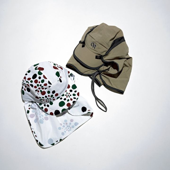 ¥6,600(アウトドアリサーチ/エイアンドエフ)、左:サンシェード部分は着脱可。グラフィックはオリジナルのタウンカモ柄。¥8,470(マーモット キャピタル/エンケル)