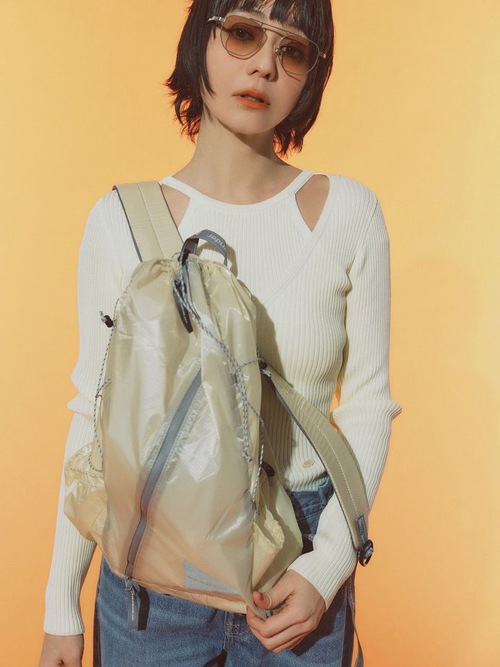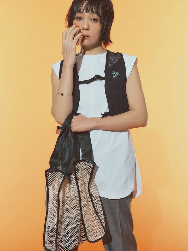 ベスト¥23,100(ゴールドウイン/ゴールドウイン カスタマーサービスセンター)、メッシュバッグ¥7,150(スピード/ゴールドウイン カスタマーサービスセンター)、トップス¥36,300(ハイク/ボウルズ)、パンツ¥64,900(エンタイア ストゥディオス/ビオトープ)、バングル¥220,000(オー/ハルミ ショールーム)