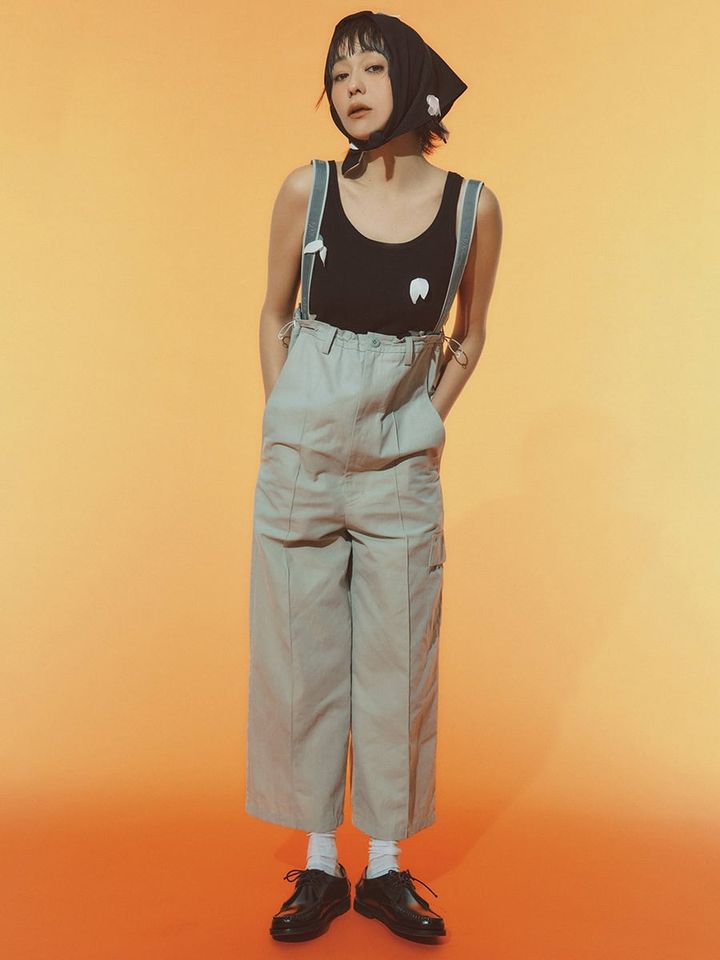 センタープレスラインに入ったコバステッチが、キレイめな印象を後押しするハイウエストパンツ。あえてサスペンダーで胸下までグイッと引き上げ、釣り人みたいに着丈短めにしても可愛い、と福田さん。全身ニュートラルカラーでまとめれば、カジュアルシックな休日スタイルに。