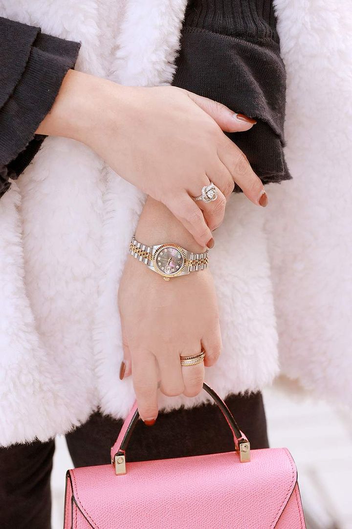 甘めコーデには「デイトジャスト」とリングのゴールドで程よい緊張感を