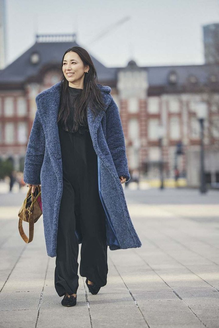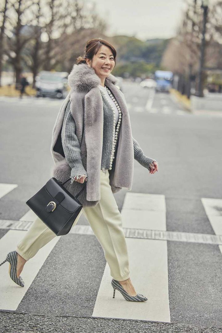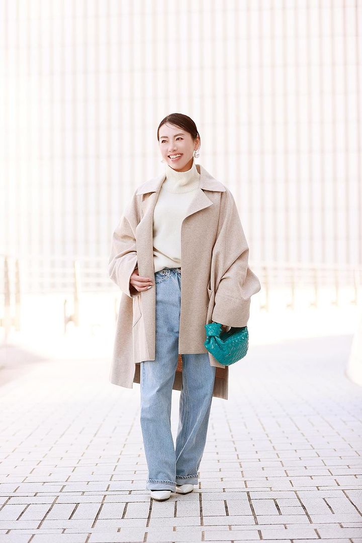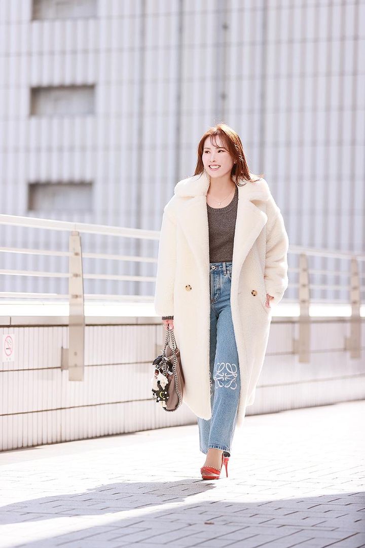 結婚20年記念に夫と見に行き、フェイスカラーが気に入って購入しました。コーデの引き締め役としてよく手に取ります。エルメスのブレスレットとリング、カルティエのクラッシュリングを合わせて辛口に仕上げました。ボリュームのあるもこもこコートにスッキリとしたロエベのデニムのバランスが絶妙でお気に入り。赤の差し色のパンプスでコーデに女っぽさをプラスしています。