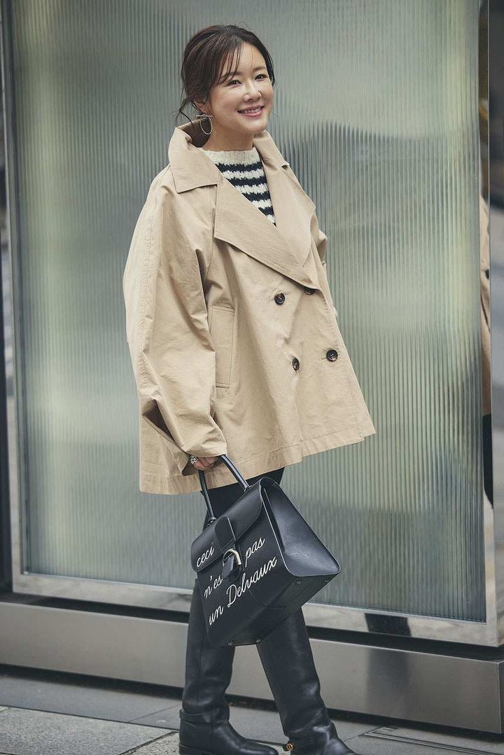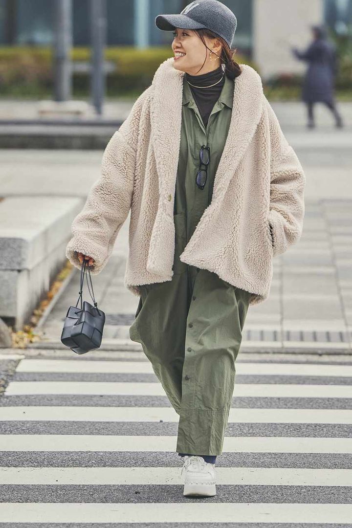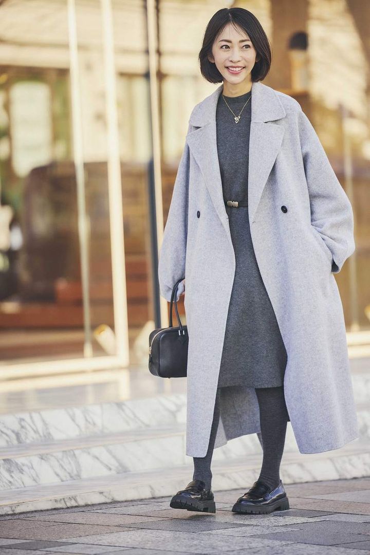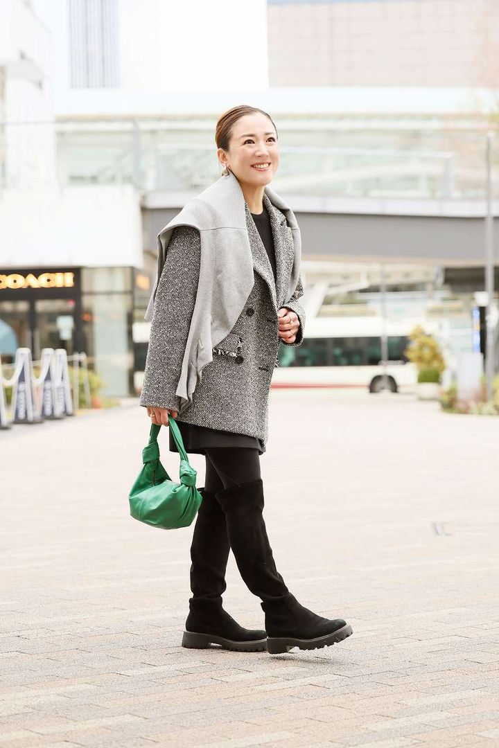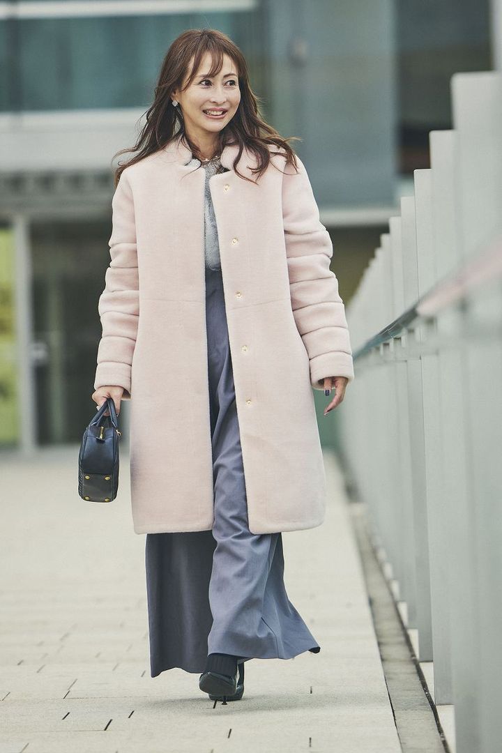 結婚20年記念に夫と見に行き、フェイスカラーが気に入って購入しました。コーデの引き締め役としてよく手に取ります。エルメスのブレスレットとリング、カルティエのクラッシュリングを合わせて辛口に仕上げました。ボリュームのあるもこもこコートにスッキリとしたロエベのデニムのバランスが絶妙でお気に入り。赤の差し色のパンプスでコーデに女っぽさをプラスしています。