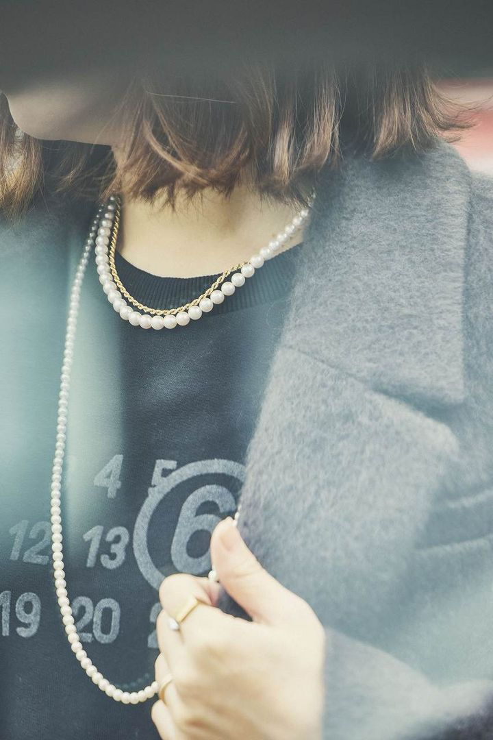 ミキモトの3連ネックレスは3本バラバラにも使えるので、色々なジュエリーと重ね付けをして楽しめる優れもの。スウェット×カーゴパンツにパールネックレスとパンプスで女性らしさを投入したのがコーデのポイントです。