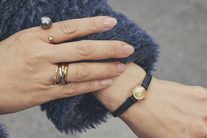 アンティークのお店で1960年代のヴィンテージロレックスと巡り合いました。サイズ感は控えめながらも、光に当たるとカットガラスがキラキラするところに惹かれてて購入しました。医療関係の仕事柄ネイルができないので、リングにはこだわっています。トリニティは10代の頃から使用している思い出のリング。リングは自分に似合うものを組み合わせて、どうコーディネートするかを楽しんでいて、気分転換にもなっています。