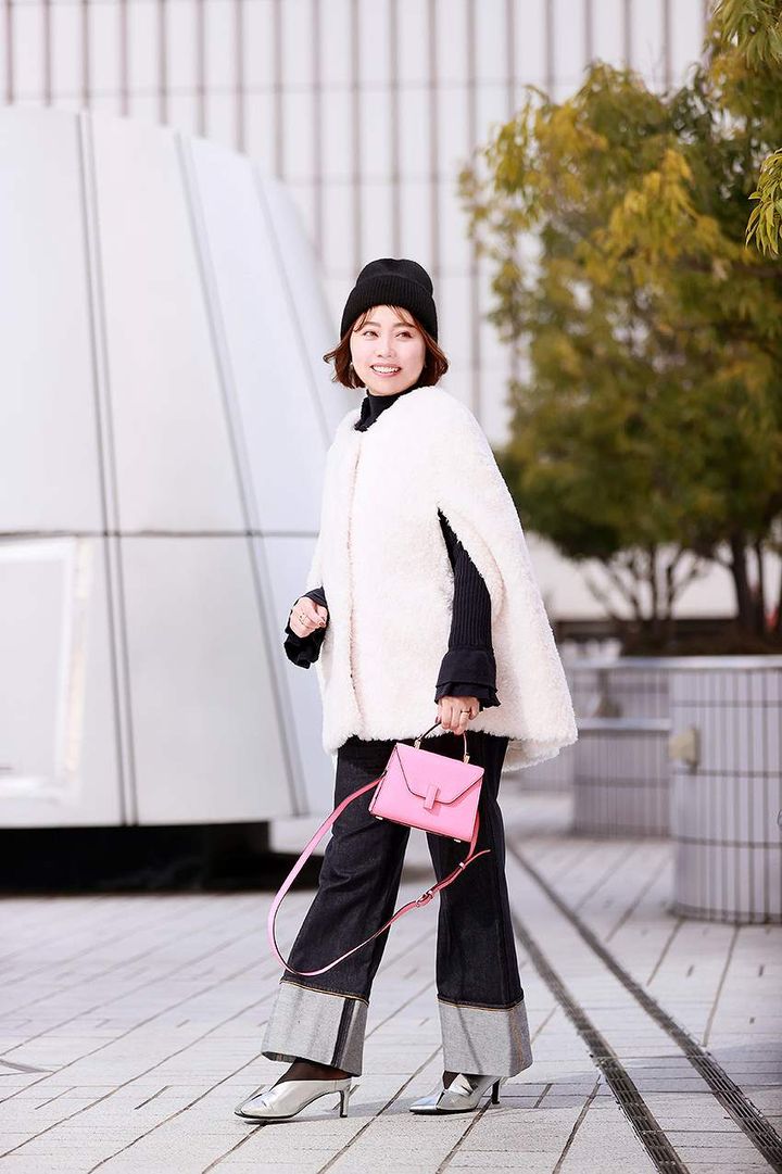 合わせたリングは婚約指輪と結婚指輪はどれもブシュロン。主人が結婚指輪をはめないので、二つ重ねてキャトルに見立てています。U-bigのふわふわケープはデニムを合わせてバランス良く。そこに可愛くキュートなピンクカラーのイジィデとビーニーをプラスして、自分らしいお気に入りコーデが完成です。