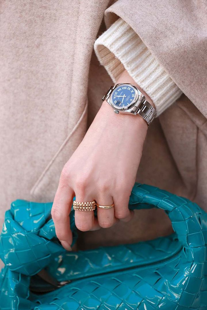 ロレックスは時計好きな主人からのサプライズプレゼント。人と被らないメンズライクなサイズ感とシルバーに黒い文字盤の色がお気に入りポイントです。ネイリストという職業柄あまりリングをする機会がないのですが、カルティエのクラッシュは特別。1つでも存在感のあるデザインとピンクゴールドが絶妙で、どんなシーンにもマッチするエブリデージュエリー。ボッテガのバッグのブルーがコーデのバランサーになっています。