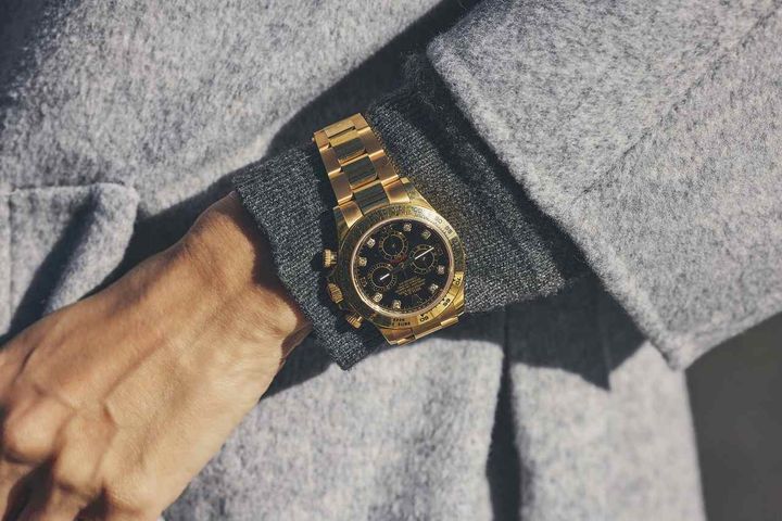 優し気なグレーのワントーンコーデがゴールドの「コスモグラフ デイトナ」で引き締まる