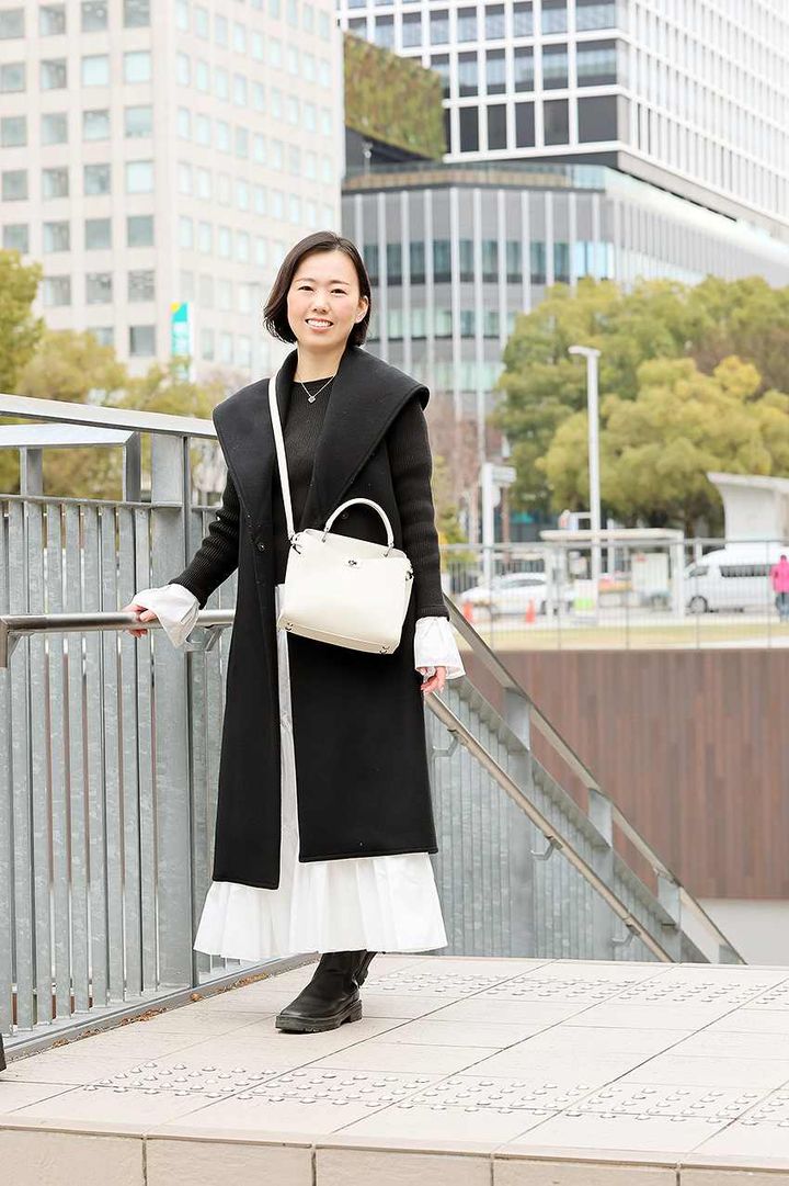 婚約の時にプレゼントしてもらったロレックスのデイトジャストはピンクシェルの文字盤に、数字のインデックスという上品さと特別感を感じられるところが気に入っています。仕事でも使いたかったのでベルトはシンプルなシルバーにしました。リングは揺れるものや大きくてインパクトのあるものなど、その日の気分でMIXして手元のスタイリングを楽しんでいます。左手薬指のスクウェア型のリングは祖母が生前最後にオーダーメイドしたものであり、母から私へ。いずれは娘へと受け継いでいきたい特別なものです。ONもOFFもモノトーンコーデが好み。cygneのスカートとプチプラニットの袖のフリルをリンクさせました。